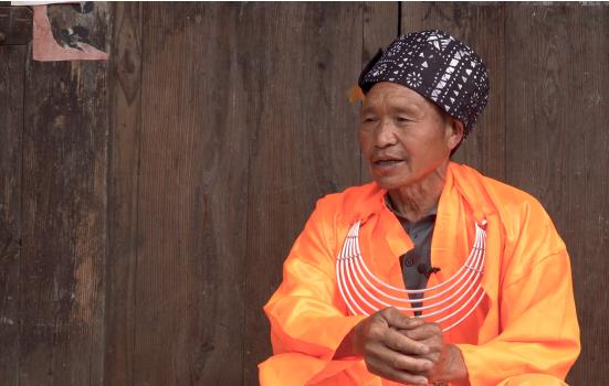 谷灑村的苗族為背牌苗,當(dāng)?shù)赜肿苑Q高坡苗。背牌苗的得名,來源自背牌苗的服飾。背牌苗男子服飾分為兩種,一種是鬼師服飾。鬼師服飾為橘黃色斜襟長衫,胸前帶銀項圈,頭部帽子是用帶有白色圖案的黑色布帶圍繞頭部而成。