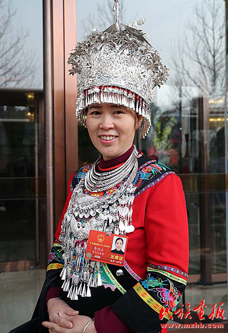 “頭頂高高的銀飾,脖子上一圈圈精美的項(xiàng)圈,走起路來(lái)叮當(dāng)作響,來(lái)自重慶市彭水苗族土家族自治縣的全國(guó)人大代表李紹玉(苗族)的這一身穿戴,一出現(xiàn)就很抓人眼球。再細(xì)看,這一身大紅的苗族傳統(tǒng)衣裝上,胸前、袖口還有繁復(fù)精致的刺繡。