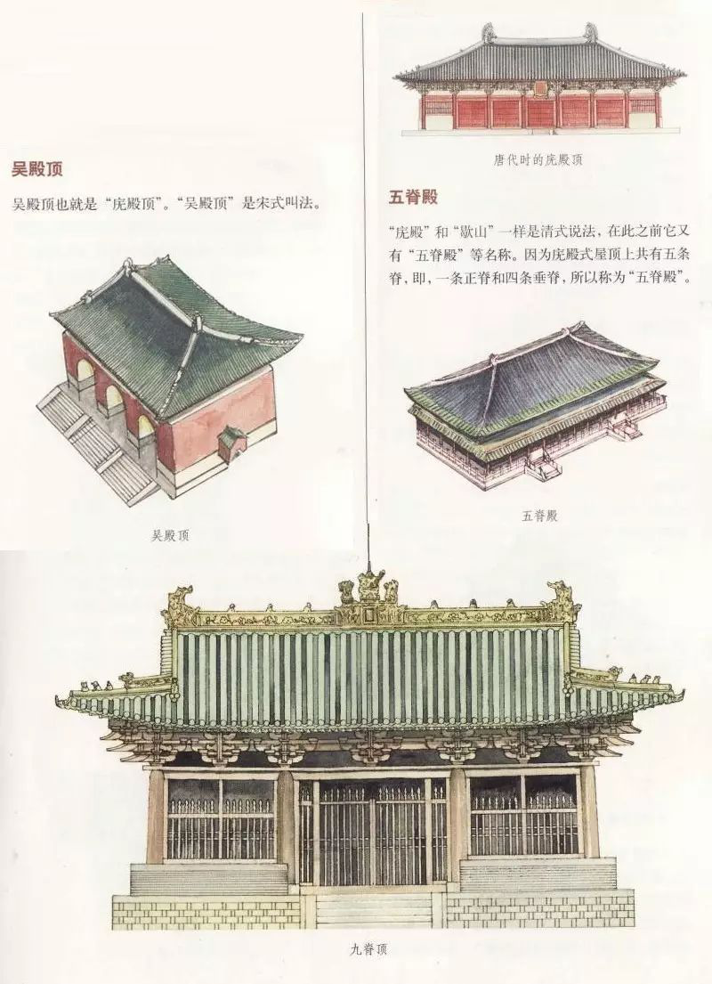 其中廡殿頂最早,約出現(xiàn)于先秦時期。在商代的甲骨文、周代銅器、漢畫像石與明器、北朝石窟中都有反映。據(jù)《周禮·考工記》載:“商人四阿重屋”,即早在商朝,已有四阿屋頂,但只是四坡水的茅草房而已。