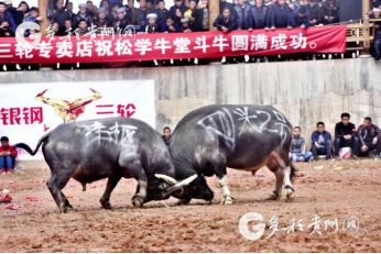 貴州省從江縣第十五屆原生態(tài)侗族大歌節(jié)的前一天,恰逢該縣逢亥斗牛日,丙妹鎮(zhèn)松學斗牛塘、谷坪鄉(xiāng)四寨河斗牛塘同時舉辦傳統(tǒng)牛王爭霸賽,喜迎一年一度“侗族大歌節(jié)”的到來,共有來自周邊村寨的80頭水牯牛參戰(zhàn),斗?;顒訄錾厦=侵?,場面異彩紛呈,吸引數(shù)萬名觀眾前來觀戰(zhàn)。