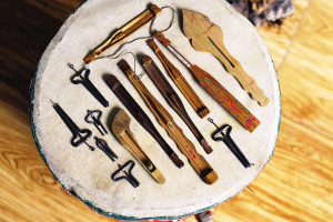 安宇歌介紹,口弦都是純手工制作的,最難制作的部分是能發(fā)音的中簧。制作中簧時,選取原料須是圓形鋼絲,先要將其砸扁,兩邊是尖的,整個簧的距離由寬到窄,窄的部位向上折彎成鉤,留兩公分長度,再折一小鉤。并且,中簧需高溫淬火,這是一個難度極高的環(huán)節(jié),全憑手感。如簧不淬火便會彈性不好,淬過了頭則一彈就碎,淬不到位會導(dǎo)致彈撥口弦時所發(fā)的聲音不佳。從某種程度上講,用口弦彈奏的音樂之所以引人側(cè)耳,關(guān)鍵就在這根中簧上。
