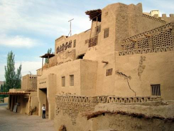 維吾爾族的居室一般是土木結構平房,其建筑方式是以粗木或沙石作基,土塊砌墻,或笆子墻,房頂架梁檁、椽后鋪葦席加土抹泥。房屋平頂,開天窗采光,四壁不開窗只留門,房門忌朝西。現(xiàn)在,建筑式樣發(fā)生變化,多留壁窗,建材也多由土木結構,向磚、混凝土結構發(fā)展。室內(nèi)布置過去較為簡單,一般多砌土炕,炕一側(cè)隔矮墻砌鍋臺,墻上留有壁翕,放置物品,喜掛壁毯。冬季多燒爐子、火墻取暖。院內(nèi)多植有葡萄和果樹花卉。房門口兩側(cè)砌土臺,上鋪氈毯,用以夏天乘涼、睡覺。