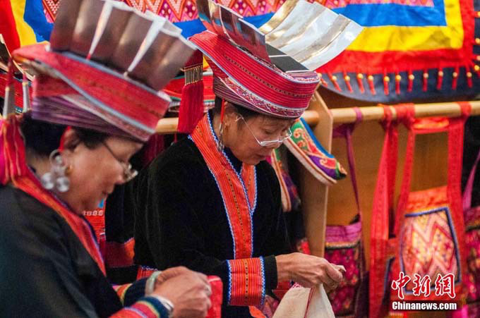12月6日,在中國瑤族之鄉(xiāng)廣西金秀瑤族自治縣的盤王節(jié)上,當(dāng)?shù)乩弦惠叕幾鍕D女展示瑤族織繡