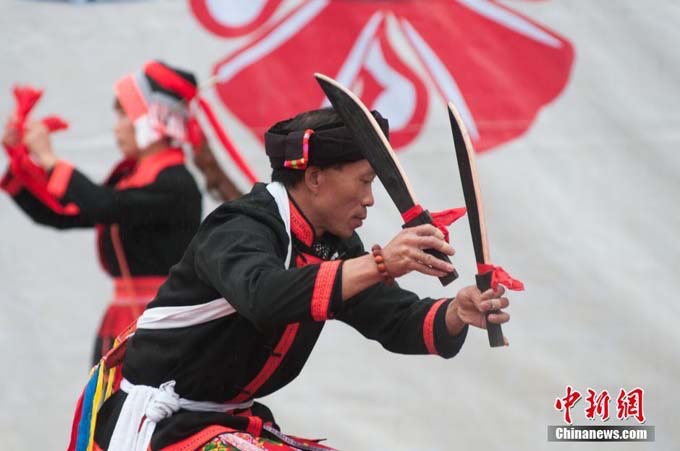 12月6日,在中國瑤族之鄉(xiāng)廣西金秀瑤族自治縣的盤王節(jié)上,當(dāng)?shù)噩幾灏傩赵谔钡段琛?/span>