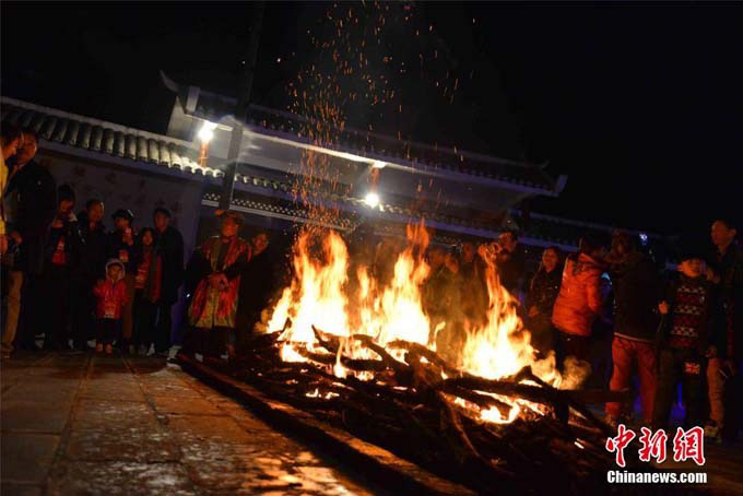 12月6日夜晚,在中國瑤族之鄉(xiāng)廣西金秀瑤族自治縣瑤族百姓在盤王節(jié)上,展現(xiàn)當(dāng)?shù)噩幾迕耖g絕技——下火海