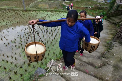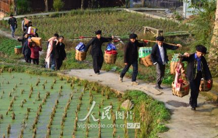 11月17日,新娘家的親戚朋友挑著賀禮前往新娘家慶賀。