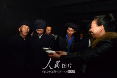 11月16日,新郎家派來的“關(guān)親客”在與新娘家的親戚喝酒對歌。