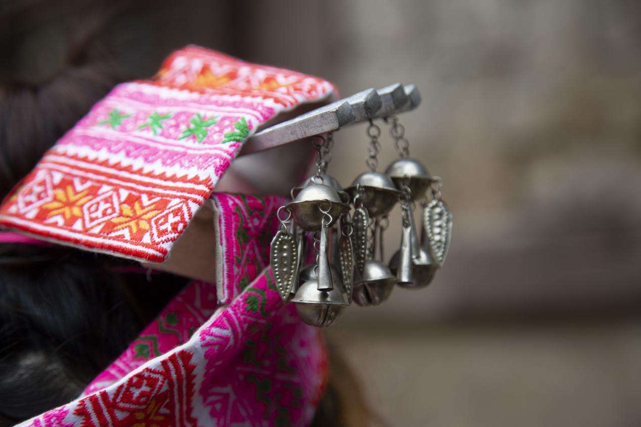 在身后可以看見(jiàn)圍腰下的藍(lán)色百褶裙,百褶裙上有波浪線條狀花紋,面積較小,百褶裙大部為藍(lán)色。女子有綁腿習(xí)俗,綁腿帶也是藍(lán)色,與服飾顏色相呼應(yīng)。女子頭飾往往以紅色布帶裹頭,用銀簪束發(fā)?!?/p>
