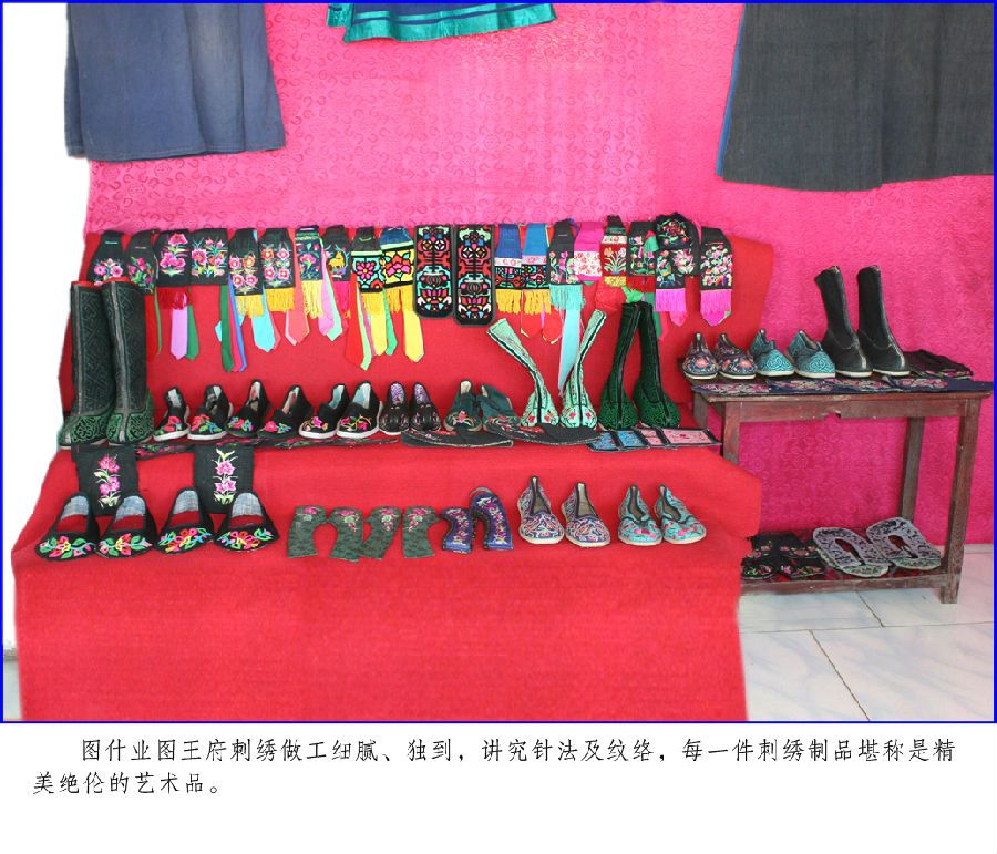 圖什業(yè)圖王府服飾包括:服裝、服飾、鞋帽及馬匹裝飾等?;蛸|(zhì)樸、清新,或漂亮、華貴,或錯落有致;既有山水,又有花鳥,形象逼真,惟妙惟肖,色彩協(xié)調(diào),圖案精美;其做工細膩獨到,講究針法及紋路,每一件服飾制品堪稱是精美別致的藝術(shù)品。