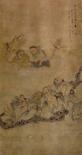 同時(shí),展覽展出的八仙題材作品中,清代王素的《八仙圖》描繪了八仙過(guò)海的場(chǎng)景,八仙形象神態(tài)各異;清代蘇仁山的《李凝陽(yáng)像》,則以墨筆描繪鐵拐李的背面,其身后背有斗笠和巨大的葫蘆,手持拐杖,作品構(gòu)圖獨(dú)特,線(xiàn)條流暢,人物形象簡(jiǎn)拙。