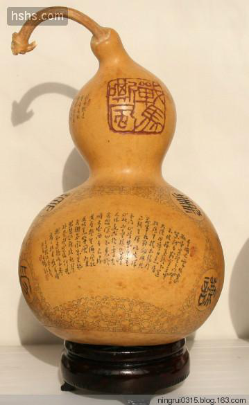 葫蘆雕集繪畫、書法、篆刻藝術(shù)于一體,傳承和發(fā)展了我國(guó)傳統(tǒng)“葫蘆文化”。甘肅的雕刻葫蘆最早出產(chǎn)于蘭州,距今約100多年,據(jù)說早期的蘭州雕刻葫蘆比較簡(jiǎn)單,對(duì)葫蘆不會(huì)做刮皮、磨光等加工處理,也不填色;只是在葫蘆表皮雕刻出山水、風(fēng)景或戲劇人物,作為兒童的玩具,在街頭巷尾出售。到了清代光緒年間,秀才蘭州人李文齋對(duì)葫蘆雕刻工藝做了改進(jìn)。他針對(duì)當(dāng)時(shí)雕刻表面粗糙、題材單調(diào)的弊端,首先將葫蘆原生表皮刮去、磨光,并用鏹水混合燃料,染成紅黃二色,是雕刻的景物不易脫落;其次,擴(kuò)大圖案創(chuàng)作題材,在原有山水、花草等圖案基礎(chǔ)上,增加了如《桃花源記》、《蘭亭集序》、《竹林七賢》等歷史文化和神話故事,形成了圖文并茂的題材格局;最后是在雕刻工具上采用了以針代刀,使圖案形象更加情景交融,栩栩如生。其雕刻葫蘆的特點(diǎn)主要是求其意態(tài)之美,追求神似;人物寥寥數(shù)筆,山水花卉濃淡相宜,形神兼具,求其風(fēng)雅;題款文字、細(xì)如蚊足,點(diǎn)綴成行,瀟灑自如。