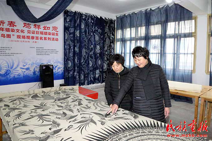 寧曼麗(右)和吳安麗在討論長(zhǎng) 10 米、寬 1.6 米的蠟畫《百鳥圖》