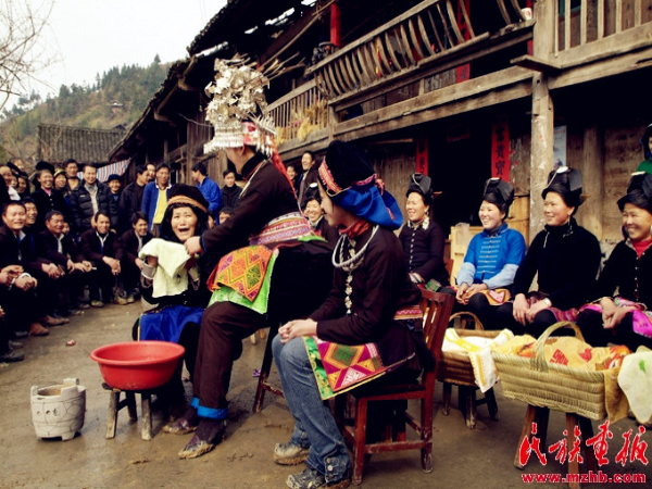 敬酒過后,新娘走上吊腳樓進入洞房休息片刻,然后與新郎一同在樓上向前來賀喜的親友拋灑喜糖。來賓蜂擁而上爭搶喜糖,一片歡騰場面。分完喜糖,新娘來到吊腳樓前的院子里用早已準備好的清水親手為婆婆擦臉,表示新媳婦對長輩的尊敬與孝心。