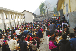 每年秋收后到翌年播種前,是四川涼山金陽(yáng)縣人結(jié)婚的黃金季節(jié)。無(wú)論是在縣城還是農(nóng)村,不管是吃“九斗碗”,還是吃“坨坨肉”,大家都喜歡擺壩壩宴。在金陽(yáng)縣城,常??梢钥吹竭@樣一幅景象:數(shù)百人聚在一處,圍坐于一張張方桌旁,伸箸暢食,舉杯暢飲。一盆盆肉端上桌子,主人不停地招呼客人趁熱吃?! ?/p>