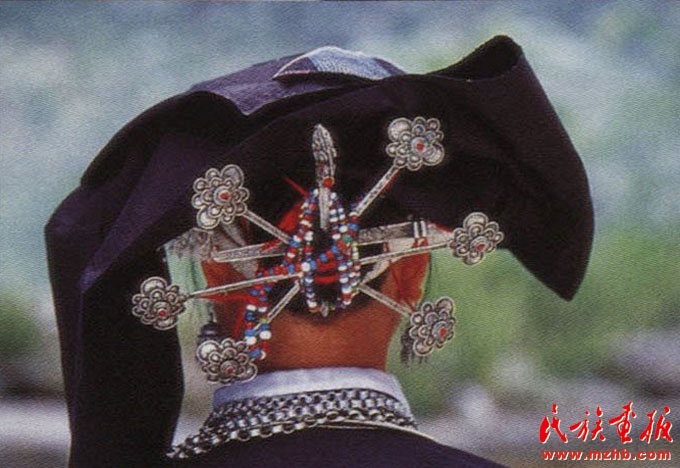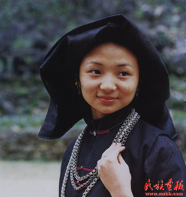 婦女的服飾更具特點,無論老少,都喜歡穿右蓋大襟和葫蘆狀矮腳圓領(lǐng)的緊身短式上衣,下身以寬褲腳、大褲頭的褲子相搭配,腰系黑布做成的大圍裙,頭帶黑布大頭巾。其圍裙既寬且長,戴時能系周身有余,裙底垂掛到小腿下部,圍裙不僅作為裝飾,而且可以作為勞動工具,遇趕圩或走親訪友和勞動時,可將圍裙底翻卷上來作成小包袱,用以包裝和盛裝物品。婦女頭巾都是一塊自己紡織染成的長條黑布,戴時先圍繞在頭上,然后翻折擺布成火棱形的圖樣,罩在整個頭上,再把頭巾的兩端分別垂掛到雙肩上,看上去樸素美觀。同時還可以當(dāng)做帽子遮蔭用。她們的衣邊、衣角、袖口、裙邊和頭巾的四邊都用紅布或黃布剪成小條以后鑲捆上去,有的則用紅、黃、藍色絲線繡成波浪形的線條,使黑中襯出紅、黃、藍色的線條來,清雅明亮,色彩協(xié)調(diào)。再加上頭發(fā)插著龍頭形的銀簪,頸項上帶有銀鏈或項圈,手帶銀圈、玉鐲,耳掛珍珠耳環(huán)等,使人一看,黑中閃艷,樸素之中亦有玲瓏之美,表現(xiàn)了她們獨特的審美觀。