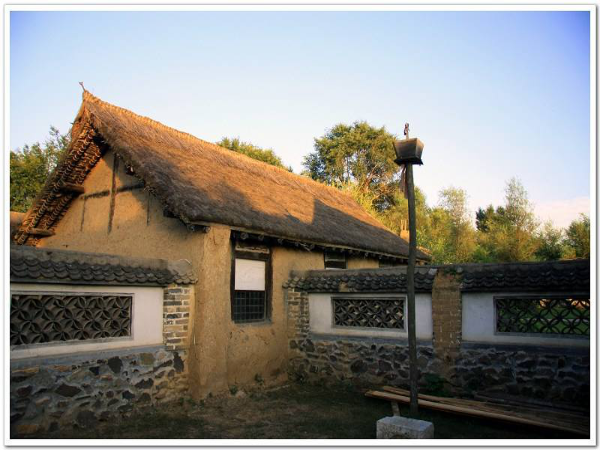 傳統(tǒng)的滿族民居的屋頂一般采用草屋頂或瓦屋頂。屋頂蓋草俗稱“苫房”,在北方農(nóng)村,這是一種很高超的手藝。通常要在木結(jié)構(gòu)的構(gòu)架頂部,先鋪上用秫秸桿(高粱桿)或者樹條子編扎的“房芭”,再抹泥填補縫隙。在其上面,將草的根部朝下,層層覆蓋,為防止滑落和被風(fēng)吹散,還需要用草繩依次交叉加固。草房頂鋪設(shè)齊整,久經(jīng)風(fēng)雨,草就變成了黑褐色,因此也叫“海青房”。