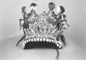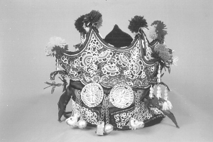 繡花帽由里外兩部分組成,素有“制做繡花帽,先做好襯套”之說。即先按兒童頭徑大小制襯套,做法較簡單,用染過的家織布做里襯,鋪上薄棉,外層為紅綢面,用線依次納緊,以防棉花下滑,縫成筒狀后,頂部用同樣的材料剪成四方形,與上部帽沿結(jié)構(gòu)相同即成。后部分較前部分復(fù)雜,先將染過的兩層家織布粘牢,表面貼上各色緞面,顏色自定。把圖樣拓在緞面上,剪下形狀不同的6片材料,把喜愛的圖案描繪在上面,接著用紡車紡出6根各4米長的棉線,用吊砣逐根旋轉(zhuǎn)纏繞白色呢絨線,經(jīng)濃縮,每根僅得到1米左右線料,將這制好的精線按圖案盤弄,后以花針固定,再輔以其他色線刺繡成圖案點(diǎn)綴其間。把繡好的6片材料組合到襯套上,各片邊沿用黑白兩色線交替鎖邊,帽口用黑金絨布滾邊。此時(shí),帽頂?shù)模吨患饨怯貌噬€制做成圓球裝飾,外面四角下面懸吊白色珍珠串,末端垂著布制五角星。帽的周邊釘上銀制品,最后鑲上反光小圓點(diǎn)飾物似天上星星般光亮,給本就精致美觀的繡花帽增添了一道靚麗色彩,繡花帽就這樣在侗家女的手中誕生了。