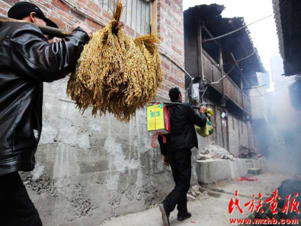 賀禮是街坊鄰居送給新娘家的禮品,在婚禮結束后的第一天下午進行。送賀禮由中老年婦女承擔,送時或單獨或結伴而行,禮品或手提或裝在竹筐里,一般都要帶上若干份,每戶一份,一次送完。禮品送到新娘家后,新娘家要進行登記并送幾塊餅干糖果以表謝意。