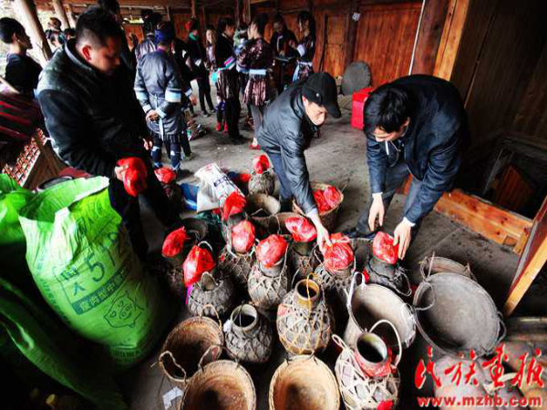 這次結婚的共有15對新人(多時有二三十對),均來自本寨的青年男女?;槎Y從大年二十六開始,共進行三天,在三天的婚禮中新郎新娘家均有婚宴,尤以第一天中午的規(guī)模最大也最為隆重。