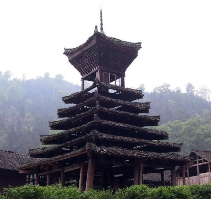 看這一座座高聳入云的鼓樓,氣勢十足,這是侗寨的標(biāo)志性建筑,爬上鼓樓最頂端,便可在侗寨中“一覽眾山小”。鼓樓的造型為杉樹,最初為“遮陰樹”。古時在樹蔭下聚會議事歌舞娛樂,但樹蔭不避風(fēng)寒。勤勞智慧的古人便仿杉樹形狀在寨中建起“堂瓦”,雨能避濕,冷能避寒。