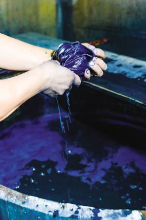 藍(lán)靛染布是一項古老的工藝,是白褲瑤服飾文化的重要組成部分。白褲瑤婦女用藍(lán)靛草來提取染布用的靛泥,隨時染藍(lán)、青棉線和青布??p制衣物的白棉布用藍(lán)靛這種天然染料染色,其色澤與一般的機織布印染有所不同。2018年8月拍攝。