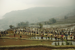 上午10點(diǎn),由上千名當(dāng)?shù)毓嶙遛r(nóng)民和彝族農(nóng)民組成的表演團(tuán)隊(duì),在20平方公里之廣袤的梯田間開始載歌載舞,展現(xiàn)當(dāng)?shù)氐纳贁?shù)民族放牛、插秧、抓魚、婚禮等生產(chǎn)生活方式。梯田、森林、村莊、河流在1小時(shí)的演出中渾然一體,征服了當(dāng)?shù)厝罕姾蜕锨型庥慰汀?/p>