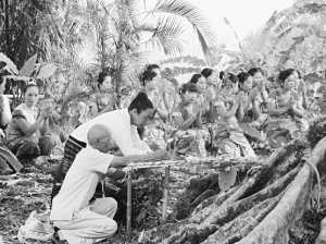 此外,人們還要定期對(duì)竜林舉行祭祀,以祈求來(lái)年風(fēng)調(diào)雨順、五谷豐登、村寨安寧。如果有人破壞了竜林,整個(gè)村寨要舉行專門的祭祀,以示賠禮道歉,乞求祖先的寬恕。