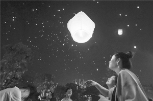 4月13日是傣歷新年的除夕夜,人們在瀾滄江邊放飛孔明燈,寄托心愿。