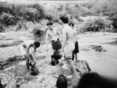 有一天,我在通什(今五指山市)的一條河邊,看見有幾個黎族人抱著大葫蘆過河。我趕緊拿出相機,在河邊的大石頭間跳來跳去追拍。沒想到一不留神就跳空了,重重地摔在石頭上,造成了骨裂,當(dāng)時就不能動彈了,在醫(yī)院里躺了好長一段時間。