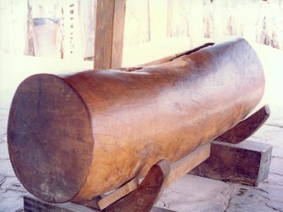 過(guò)去,佤族凡新建一個(gè)村寨,就要先找水源定寨址,再拉木鼓蓋木鼓房。佤族認(rèn)為木鼓是天神莫偉的床,木鼓房是莫偉的家,只有拉了木鼓,請(qǐng)莫偉天神進(jìn)寨保佑、才能建房立寨,拉木鼓的日子一般在佤歷一月,即公歷10月進(jìn)行。是時(shí),先由寨子派出有經(jīng)驗(yàn)的老人3—5人進(jìn)山選擇樹(shù)木,將選定的樹(shù)木每棵劈一點(diǎn)樹(shù)皮回來(lái),由魔巴殺雞卜卦,哪棵的卦好就確定為做木鼓的樹(shù),而后由魔巴率領(lǐng)青壯年男子進(jìn)山將樹(shù)砍倒,斷出一截做木鼓用。全寨男女老少盛裝艷服將木頭拉回,鑿成木鼓,安放于鼓房?jī)?nèi)。拉木鼓的場(chǎng)面極為熱鬧壯觀,人們以能摸一下拉木鼓的繩索為最大的榮耀。木頭拉到寨外要舉行隆重的剽牛祭神儀式才能將木頭拉進(jìn)寨內(nèi)。木鼓有公母之分,公木鼓用紅毛樹(shù),母木鼓用麻公樹(shù)。鼓長(zhǎng)1.5-2米,鼓身直徑70—100厘米,一般是扁形和方形。洞深40-50厘米,洞口寬4-5厘米,長(zhǎng)1.2-1.4米。洞呈瓜瓢形。背端多有牛頭形浮雕。由于所用本質(zhì)不同,公木鼓發(fā)音高亢清亮,母木鼓沉渾悠揚(yáng),響聲遙遠(yuǎn)。過(guò)去,只有逢村寨大事或械斗或集會(huì)議事,或祭祀鬼神,或告急友鄰才能敲響木鼓,平時(shí)是不能隨便敲的。由于佤族歷史上有獵人頭祭祀木鼓的習(xí)俗,村寨部落間經(jīng)常發(fā)生血族復(fù)仇的械斗。隨著獵頭陋習(xí)的革除,木鼓已從原始祟拜的氛圍中擺脫出來(lái),成了人們喜愛(ài)的敲擊樂(lè)器,佤族編創(chuàng)了自?shī)首詷?lè)的木鼓舞。