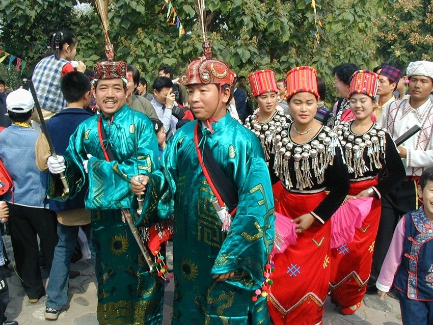 目瑙節(jié):又稱“總戈”,景頗語(yǔ)音譯,意思是“大伙跳舞”。目瑙節(jié)是景頗族最盛大的傳統(tǒng)節(jié)日,一般于每年農(nóng)歷正月十五以后的九天內(nèi)擇雙日舉行,節(jié)期三至五天不等。目瑙作為一種大型的群眾性歌舞活動(dòng),由來(lái)已久,歷史上,每逢豐年,出征、凱旋、婚姻嫁娶、敬祭鬼神等重要活動(dòng),均要跳“目瑙”。景頗族的“目瑙縱歌”原來(lái)是一種融宗教和文化習(xí)俗為一體的傳統(tǒng)慶典。隨著社會(huì)的發(fā)展,逐漸演化為各種不同類別的“目瑙”。大致有以下幾種:①“歲目瑙”,家庭財(cái)源茂盛,人丁興旺時(shí)舉行;②“布當(dāng)目瑙”,征戰(zhàn)取得勝利時(shí)舉行;③“貢冉目瑙”,同胞兄弟分家自立門戶時(shí)舉行;④“騰肯目瑙”,新建房屋住所落成時(shí)舉行;⑤“空然目瑙”貴族家娶親辦婚禮時(shí)舉行;⑥“達(dá)如目瑙”,出征時(shí)舉行;⑦“昔目瑙”,有名望的長(zhǎng)者去世送葬時(shí)舉行;⑧“柱目瑙”,祭奠“木代”神時(shí)舉行。不同類別的“目瑙”都有特定的內(nèi)容和表現(xiàn)形式,但有一個(gè)共同點(diǎn)就是整個(gè)過(guò)程都是由“瑙雙”(領(lǐng)舞)隊(duì)和“瑙巴”(表演)隊(duì)組成的舞隊(duì)來(lái)表現(xiàn)和完成的。每逢目瑙節(jié)日,村村寨寨的景頗人身著節(jié)日盛裝,紛紛從四面八方涌入目瑙廣場(chǎng)。廣場(chǎng)上人山人海,氣氛熱烈歡快而不失莊嚴(yán)古樸的特色。廣場(chǎng)中央高豎著四根長(zhǎng)約4米的目瑙柱,亦稱雌雄柱,中間兩根為陰,外面兩根為陽(yáng),上面皆繪有精美而富有象征意義的圖案:右邊柱上往往繪以蕨菜花紋,象征團(tuán)結(jié)奮進(jìn);左邊常畫回紋構(gòu)成若干個(gè)四方形,并涂以不同顏色,表示景頗族的遷徙路線;中間兩根柱子之間,交叉著兩把長(zhǎng)刀,為景頗民族驍勇強(qiáng)悍、堅(jiān)強(qiáng)剛毅性格的具體標(biāo)志。目瑙柱的左側(cè)立著一個(gè)方形架子,上層是吹嗩吶的座位;前面掛著一個(gè)兩米長(zhǎng)的大皮鼓和一面直徑一米多的大芒鑼,供跳舞時(shí)伴奏用。廣場(chǎng)四周用竹籬笆圍起,目的是為了防止野鬼的侵入和牲畜的干擾。舞蹈開(kāi)始時(shí),鼓樂(lè)齊鳴,由兩位德高望重且又熟悉目瑙舞路線的老人身穿大龍袍,頭戴飾有孔雀、野雞羽毛和野豬牙齒的目腦帽,手持長(zhǎng)刀領(lǐng)頭,后面跟著背銅炮和持長(zhǎng)刀的隊(duì)伍,婦女們拿著扇子或彩帕跟在最后,邊歌邊舞,熱鬧非凡。參舞者少則百多人,多則幾千人,從清晨到日暮,以日暮到清晨,通宵達(dá)旦,其間舞者跳累時(shí)可自動(dòng)退場(chǎng)小歇片刻,然后繼續(xù)登場(chǎng)舞蹈。“目瑙縱歌”作為一個(gè)民族的傳統(tǒng)活動(dòng)發(fā)展至今,宗教色彩和類別已日益淡化,它已成為景頗族約定俗成的傳統(tǒng)節(jié)日,統(tǒng)稱為“統(tǒng)肯(傳統(tǒng))目瑙”并賦予了新的內(nèi)涵,其內(nèi)容和形式都是展示一個(gè)民族的傳統(tǒng)文化,反映今天的新生活和對(duì)未來(lái)的美好向往。