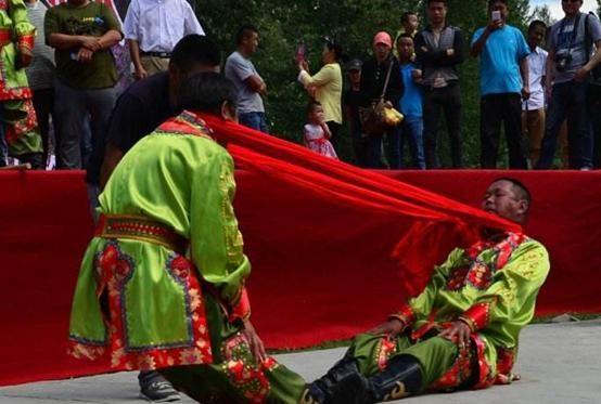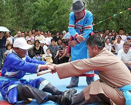 頸力賽和扳棍一樣,也是達(dá)斡爾族傳統(tǒng)的競(jìng)技項(xiàng)目之一,在達(dá)斡爾族之間十分流行。頸力賽的比賽方式和扳棍相似,比賽雙方需要端坐在平地上,蹬直雙腿,腳掌相對(duì),雙手叉腰或放在腿上,用布腰帶套在雙方脖頸后部。當(dāng)裁判員聲響后,比賽雙方需要互相用脖頸力拉扯對(duì)方,哪一方被拉起或屈膝歪倒,就輸?shù)袅吮荣悺?/p>
