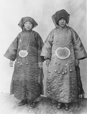 這是美國傳教士畢敬士影集中收錄的卡特·霍頓拍攝的又一張和撒拉族新娘有關(guān)的照片,此片也攝于青海循化。照片中的兩位撒拉族姑娘穿著鮮艷漂亮的衣服和翹尖的繡花鞋,佩戴著銀制的胸飾、墜子、項鏈、耳環(huán)和頭飾等。