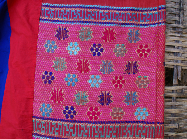 三角鉤鋤是毛南族特有的生產(chǎn)工具,毛南語(yǔ)叫“拱”。它小巧輕便,適合在雞窩地里中耕鋤草,又用于點(diǎn)種黃豆。種黃豆還有一種木制的“點(diǎn)穴錘”,用8寸到1尺長(zhǎng)的金剛木削成圓桿,形如搟面杖,中間插一木柄,手握木柄在泥土里一錘,就成一個(gè)如雞蛋形的坑,即可放入黃豆,蓋上草木灰。這種“點(diǎn)穴錘”一錘一穴,工效很高,是種黃豆的最佳農(nóng)具。此外還有禾剪、割煙刀等(圖為毛南族織錦)。
