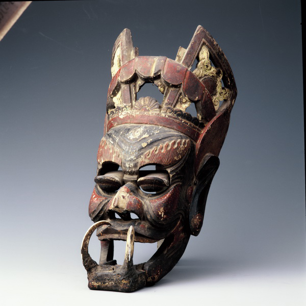 民族文化宮博物館所藏儺面具“山王”呈兇惡之相。它頭戴高大的雕花頭冠,大耳,尖尖的耳翅取代了抱耳神,劍眉倒豎,雙眼可自由閉合,鼻梁高聳,大嘴寬闊,下頜活動(dòng)自如,長(zhǎng)獠牙畢露,神情兇猛可怖,面部飾紅黑兩色。其造型、色彩、神態(tài)給人恐怖猙獰之感。