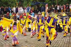 圖①為祭師們手捧獻(xiàn)給祖先的瓜果、茶、酒,等待儀式開始。圖②為在樂祭中,祭師們跳起歡快的娛神舞。