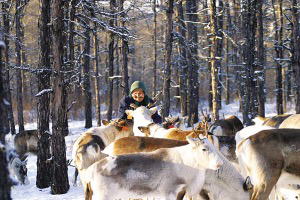 人類馴養(yǎng)馴鹿的歷史有1000多年。這是一種異常勇敢的生靈,生活在北極圈附近,分布在歐亞和北美大陸及一些大型島嶼。在極度惡劣的自然條件下,馴鹿為了繁育后代,每年都要冒著生命危險(xiǎn)長途跋涉數(shù)百里,其堅(jiān)韌不拔的意志力和不屈不撓的品格正是北極冰原精神的象征。在中國,馴鹿棲息在大興安嶺北段的寒溫帶針葉林中,處于半野生狀態(tài),這里有激流河、阿穆爾河、阿巴河、呼瑪河,有阿龍山、奧克里堆山等。食物主要是苔蘚,也吃石蕊、蘑菇及大木植物的嫩枝葉。鄂溫克族的祖先把鹿視為圣潔,賦予其許多美麗的神話和傳說。是啊,只要有了馴鹿,鄂溫克人便是幸福的。據(jù)考證, 我國的馴鹿與貝加爾湖東北部尼布楚河上游溫多苔原高地的馴鹿有淵源關(guān)系??梢哉f,鄂溫克人的馴鹿、狩獵、樺皮文化、薩滿教把北極文化延伸到了興安嶺。