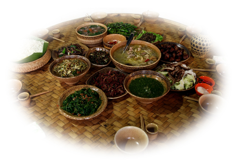德昂族絕大多數(shù)以大米為主食,部分地區(qū)雜以包谷和薯類。均以蒸燜而食,擅長制作各種糧食制品,如:豌豆粉、豆腐、米粉、年糕、粑粑、湯圓等。蔬菜種類繁多,竹筍是四季不斷的蔬菜之一,除鮮吃外,多加工成酸筍或干筍食用。其他蔬菜的食用,都習(xí)慣于在煮燉時配酸筍,或加油、豆豉、鹽成雜熬菜。酸筍用途十分廣泛,即使在燉雞、炒肉或烹魚時都要加酸筍調(diào)味。受當(dāng)?shù)貪h族的影響,許多漢族風(fēng)味的腌菜、腐鹵也是德昂族餐桌上常見的小菜。德昂族民間制陶和使用竹編制品歷史悠久,所有炊餐用具,大都是自制的陶器和竹器。