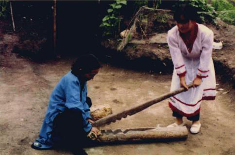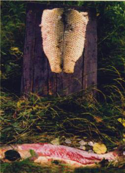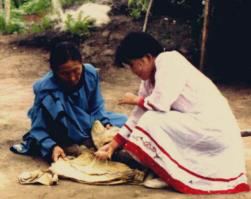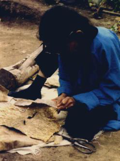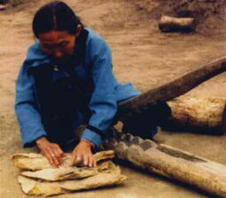 圖八 圖九 赫哲族婦女用木鍘刀熟魚皮 將熟好的魚皮連成大片