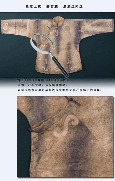 赫哲族的魚皮衣歷史久遠(yuǎn)。我國古代文獻(xiàn)《山海經(jīng)》第九卷《海外東經(jīng)》中便有“玄股之國,在其(黑齒)北,其為人衣魚食鷗” 的記載?!耙卖~”西晉學(xué)者郭璞解釋為“以魚皮為衣也。”說明早在兩千多年前,赫哲族的先民就已使用魚皮做衣服了。另據(jù)密山新開流新石器時(shí)代遺址中出土的魚叉及骨針,證明赫哲族的先民捕魚和縫制魚皮衣有數(shù)千年歷史了。清代張晉彥的《寧古塔山水記》有:“魚皮部落,食魚為生,不種五谷,以魚皮為衣,暖如牛皮”的記載。《皇清職貢圖》記載:“赫哲衣服多用魚皮而緣以色布,邊綴銅鈴,亦與鎧甲相似?!绷硗猓胤街緯鴮?duì)此也多有記載??梢姡照茏逯谱骱痛┲~皮衣是真實(shí)而久遠(yuǎn)的。