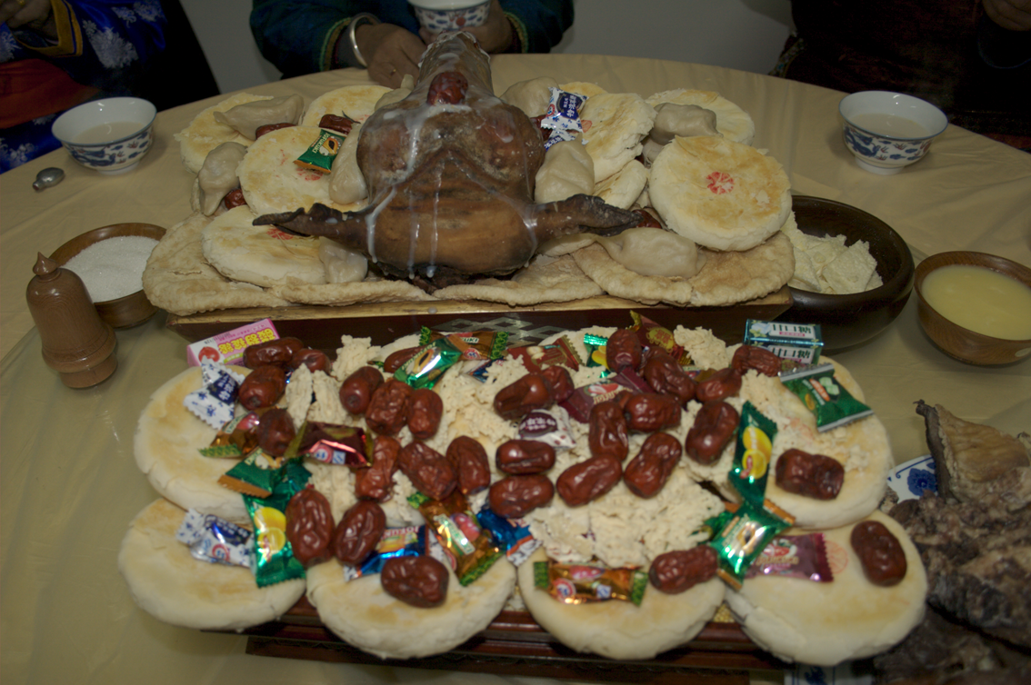 全羊席,又稱整羊席(蒙古語為“布禾勒”或“酥斯”),是蒙古人招待貴賓的傳統(tǒng)佳肴,也是蒙古民族最古老、最隆重的一道宴席,一般只在盛大宴會(huì)、隆重集會(huì)、舉行婚禮或接待高級(jí)貴賓時(shí)擺設(shè)。將整羊加工后擺在長方形的大木盤里,像一只臥著的羊,肉味鮮美,香飄滿堂。賓客在進(jìn)餐前,還要舉行一定的儀式,高唱贊歌,朗誦獻(xiàn)整羊祝詞等。據(jù)文獻(xiàn)記載,成吉思汗曾設(shè)過全羊宴。忽必烈登基時(shí),也設(shè)全羊宴祭神祇、待賓客。至清代全羊宴更加盛行,現(xiàn)已成為蒙古民族風(fēng)格接待貴賓的名貴菜肴,馳名中外。