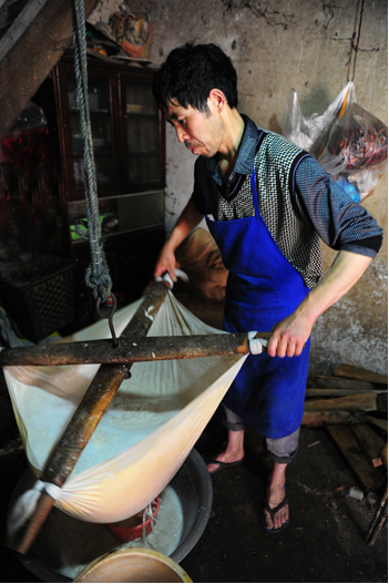 記者看到,主人開始磨豆子了,將泡好的豆子倒入機(jī)器內(nèi),一勺一勺的盛。并一邊磨一邊和我們交談,現(xiàn)在省事多了,以前都是推磨子的,而且制作工藝也十分講究。