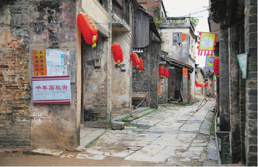 千年老街自北向南,寬約4米、長約300米,青石板路面。沿街多為典型的嶺南風(fēng)格建筑,二層騎樓,房屋寬敞深長,一樓為鋪,二樓為居,前為店,后為廚。天井頂面多設(shè)明瓦數(shù)塊,以取日光照射,木梯扶手、門窗雕刻的粗細(xì)花紋無聲地證明它們曾經(jīng)的風(fēng)采。看得出當(dāng)年舊街果然是繁華過的,有飯館,有劇院,有酒肆,有客棧,有百貨,街道排水、布局都很合理,有的街道至今在門前仍有留有水道。