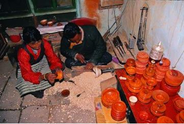 西藏人喝茶,一般都用的是木碗。木碗的用法,很有講究。光景好的人家頓頓喝的是酥油茶,貧寒人家向來(lái)靠清茶打發(fā)日子。但是有錢漢也好,窮光蛋也罷,喝茶卻都用木碗。即使有了玉碗和瓷碗,人們?nèi)源骨嘤谀就?。在家用它,出門也用它,形影不離,浪跡天涯的旅人的懷里都揣著個(gè)木碗,人在碗在,碗不離人。居家過日子,沒有不出門的人。小小一個(gè)木碗,在家有在家的用法,出門有出門的講究。木碗雖小,其俗頗豐。