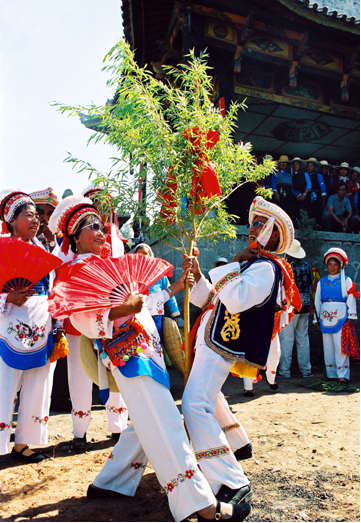 “繞三靈”活動的特點,除了向本主神靈祈求風調雨順的內容之外,主要在于其歌舞活動所表現(xiàn)的男女情愛無所顧忌,放達不拘。每個歌舞隊列領頭者均為男女巫二人,他們以一手共執(zhí)一株齊人高的樹枝,另一手分別揮舞牦牛尾和花手巾,邊舞邊唱,引領著隊伍緩緩前行。樹枝上掛著紅綢系著的葫蘆,據(jù)說葫蘆象征母腹,紅綢象征陰血。他們口唱的調子稱“活恩枯”直譯為“花柳曲”,一唱一和,幽默風趣。其后的歌舞隊列,唱的也都是充滿艷情的調子,跳的是霸王鞭和八角鼓舞,舞姿多有男女背靠背、心合心、腳勾腳等形式,無拘無束地表達著熾熱的情感。