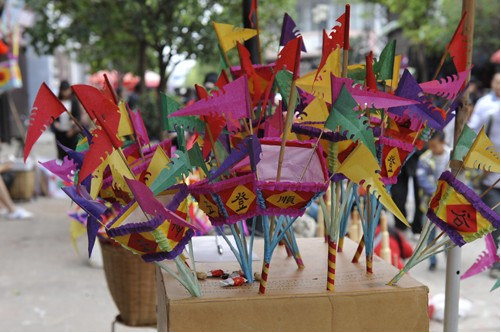 早上十點(diǎn)左右,火把就快扎好了。色彩鮮艷的紙裱斗升上各色卷著的彩旗正一個(gè)個(gè)被打開(kāi),梨、蘋果、花紅正被栓成一串串地掛在樹(shù)枝上,水泥桌上擺著小旗、炒蠶豆和糖果等,老人們?cè)谝慌赃呅吜?,一盤彩色米干在燦爛的笑著。