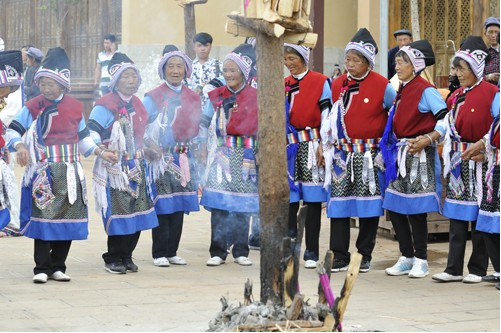 到了這一天,親友鄰居都不請(qǐng)自到來(lái)幫忙和祝賀。綁扎柴禾,做小彩旗,栓水果串等,等一切都好,再齊心合力豎起火把。等掛著果串的斗升一點(diǎn)點(diǎn)離開(kāi)地面,火把樹(shù)穩(wěn)穩(wěn)當(dāng)當(dāng)挺立的時(shí)候,孩子的奶奶和外婆就在火把樹(shù)下燃起香,敬上茶酒和米干,虔誠(chéng)地磕頭祈禱。