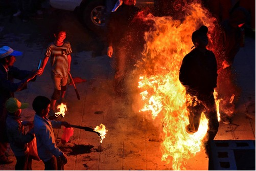 不到黃昏,鞭炮聲就響起來(lái)了。新生兒的父親點(diǎn)燃火把后,孩子們迫不及待地拿著小火把和松明粉,跑來(lái)跑去燒新生兒的的各種親戚,大人們樂(lè)呵呵地接受孩子們噴灑過(guò)來(lái)的火焰,并一致說(shuō)著很吉祥的祈愿祝福語(yǔ)。“從此晦氣不在嘍!”、“一年更比一年好呀!”、“紅紅火火又一年”。男女老少在火把樹(shù)下吃喝玩樂(lè),其樂(lè)融融。糖、炒蠶豆、梨、蘋果等被大家傳來(lái)傳去,新生父親挨個(gè)向親友敬酒。親友鄰居喝著喜酒,一致祝福新生兒安康成長(zhǎng),將來(lái)富貴吉祥。