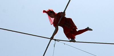 “達(dá)瓦孜”既是少數(shù)民族傳統(tǒng)體育運(yùn)動(dòng)表演項(xiàng)目,也是節(jié)日里娛樂活動(dòng),它有雜技和體育的雙重特點(diǎn)?!斑_(dá)瓦孜”高空走繩表演十分壯觀,在空曠的場(chǎng)地上,中間聳立三十多米高的立桿,頂處扎一牌樓上掛彩旗。牌樓橫桿兩端有表演用的吊杠和吊環(huán)。表演技能的繩索長(zhǎng)八十多米。表演者手持長(zhǎng)約6米的平衡桿,不系保險(xiǎn)帶,在繩索上作前后走動(dòng)、盤腿端坐、蒙眼行走,甚至腳踩碟子、飛身跳躍等一系列驚心動(dòng)魄的動(dòng)作。經(jīng)過不斷實(shí)踐和發(fā)展,“達(dá)瓦孜”表演技巧有了新突破,在濃郁民族風(fēng)味維吾爾族民間樂曲伴奏中,表演者輕松自如地在、高空繩索上踏著節(jié)拍跳舞歌唱,并且敏捷地變換著高難動(dòng)作。