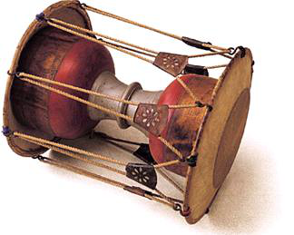 鼓框?yàn)槟举|(zhì),兩面蒙皮,用繩索固定在木框兩邊。鼓鏈木質(zhì),通常在表演中負(fù)責(zé)敲擊主要旋律的重拍,也有獨(dú)奏的情況,聲音有力。